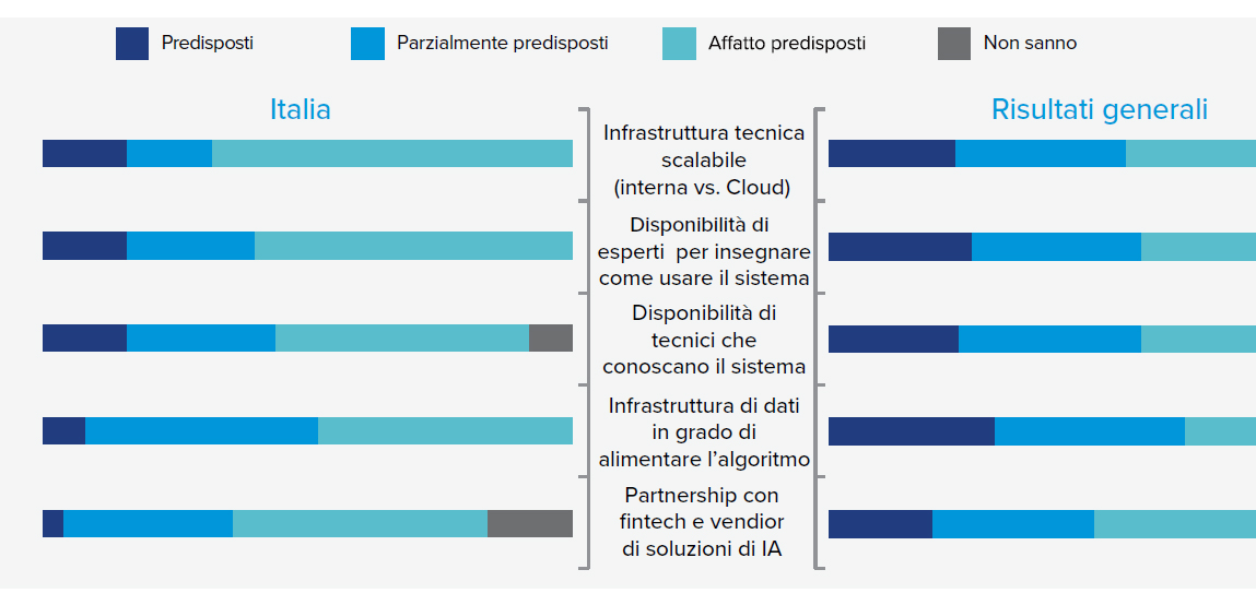 Quasi tre quarti delle banche italiane riconosce l’importanza dell’IA: due intervistati su cinque la considerano importante a livello tattico e un ulteriore 22% di importanza strategica. Il 27% degli intervistati italiani che considera le soluzioni di IA prive di importanza segna, tuttavia, la percentuale più elevata riscontrata tra tutti i Paesi oggetto dello studio.